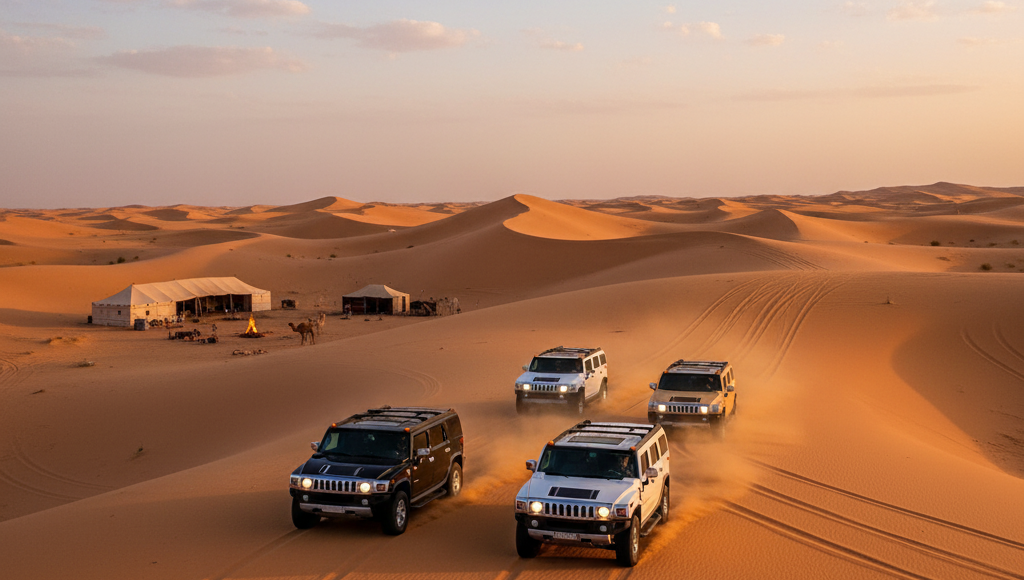 A Hummer safari is a blend of thrill, luxury, and Arabian hospitality. Here’s a detailed look at the experience: