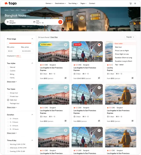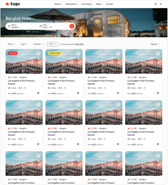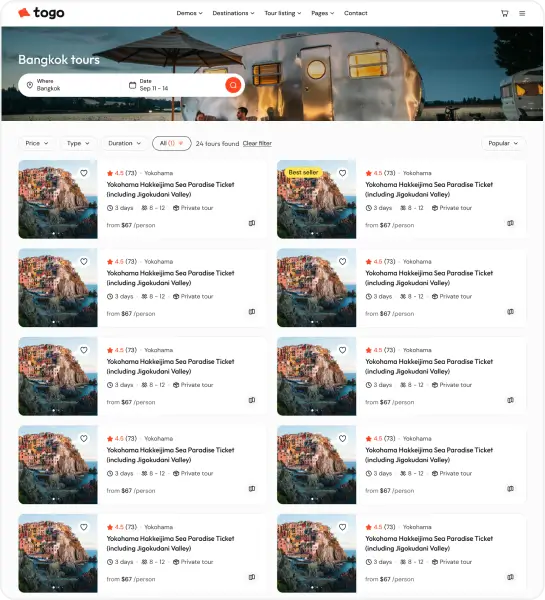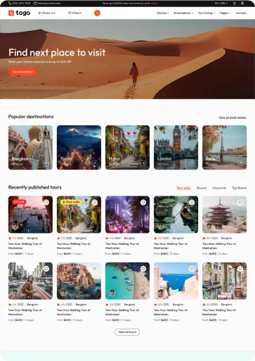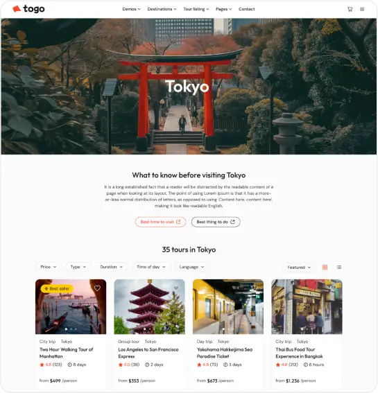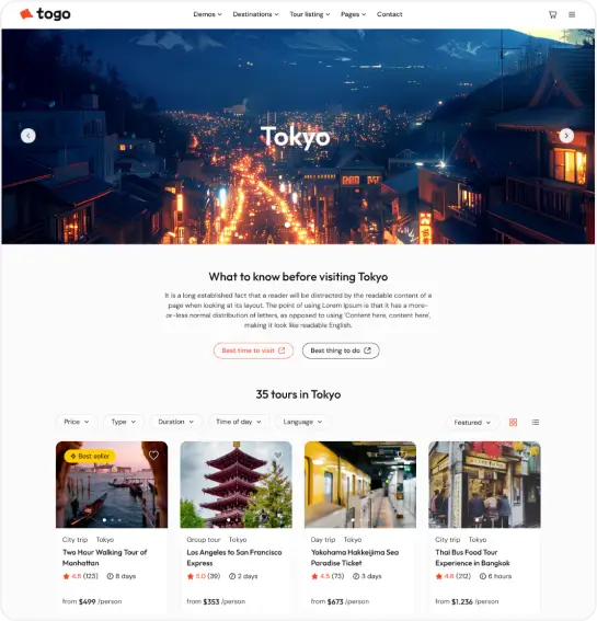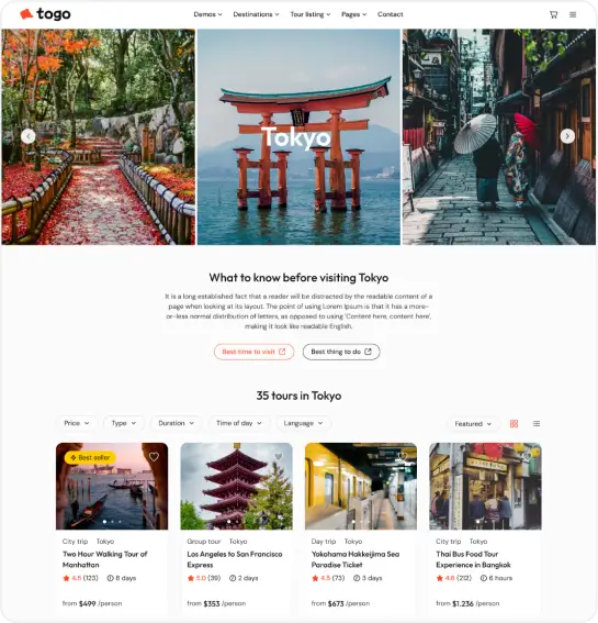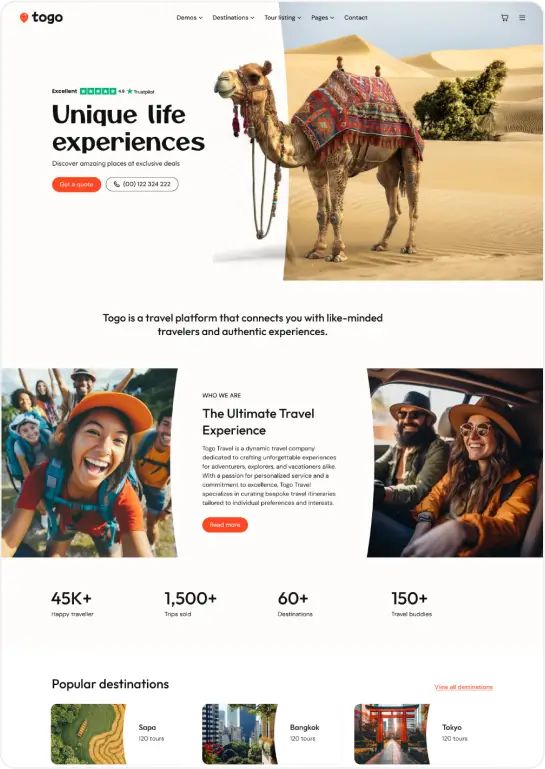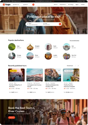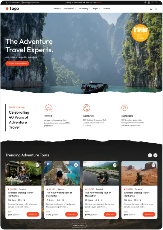 Togo is a professional WordPress theme that makes it easy to build a modern, beautiful tour booking website with full features for reservations, payments, and tour management.